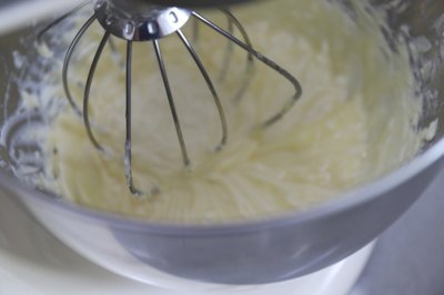 Маргарин «Экокрем 1403-32» взбить до легкого побеления. Температура маргарина — 9-10 ºС. После — постепенно вносится остывшая яично-молочная масса. В конце добавить коньяк. Взбить до однородности.