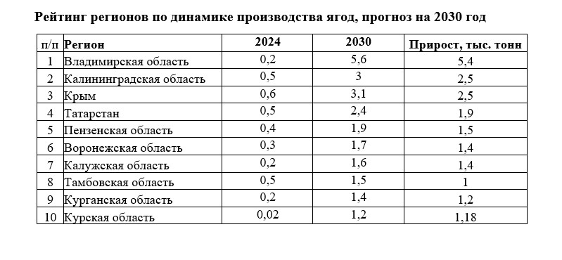 В целом на десять регионов-лидеров, включая Калининградскую область, Крым, Татарстан, Пензенскую, Воронежскую, Калужскую, Тамбовскую, Курганскую и Курскую области, к 2030 году будет приходиться около 45% всего урожая ягод в стране. По оценке экспертов, именно сочетание региональной диверсификации, технологического обновления и активности малого агробизнеса станет основой устойчивого роста ягодной отрасли в России в ближайшие годы.