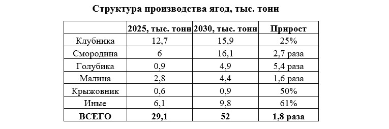 «В 2026 году мы прогнозируем производство ягод на уровне 32,8 тыс. тонн, что на 13% выше показателя 2025 года, а по итогам 2030 года — уже 52 тыс. тонн. Ягодный бизнес остается сегментированным, при этом более 90% продукции приходится на малые формы хозяйствования», — отметил Олег Князьков.